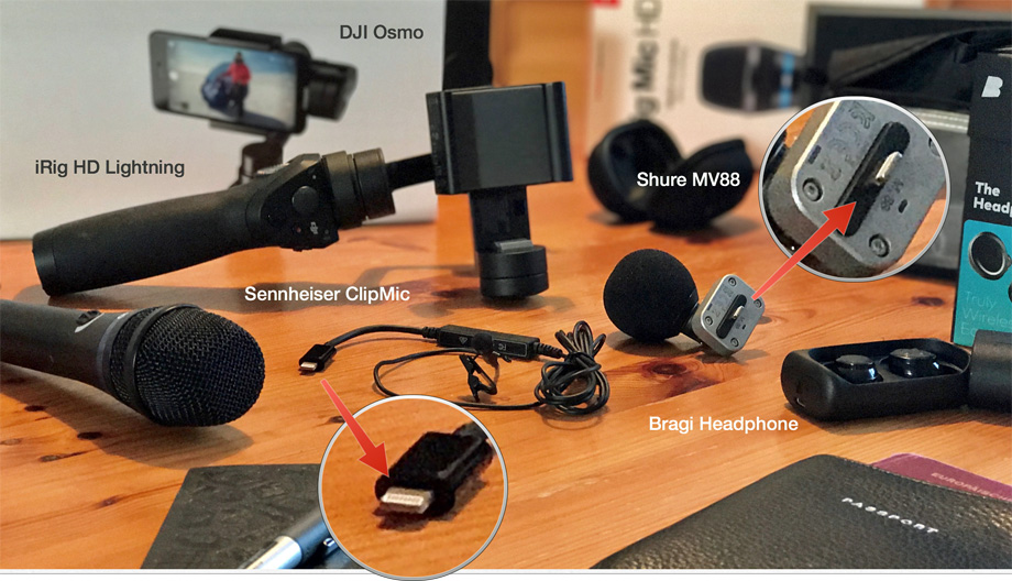 Kommen wir zum Ton, der mit den bald omnipräsenten EarPods auch bei Videos an Bedeutung gewinnen wird. Weil das iPhone 7 keine Stereo-Klinke mehr bietet, habe ich auf den Lightning-Anschluss umgerüstet. 3 neue Mikrofone für 3 unterschiedliche Einsatzgebiete: Für Straßenumfragen gibt’s den Klassiker iRig von IK Multimedia nun als sog. HD-Variante für iPhone* und für Android (nicht getestet)*. Neu: das Mikrofon kann mit zwei Kabeln verwendet werden (liegen bei) – einmal Lightning und einmal USB. Damit lässt es sich auch für Mac und PC verwenden. Und: die Aufnahmelautstärke lässt sich jetzt variabel mit einem Drehrad einstellen.
